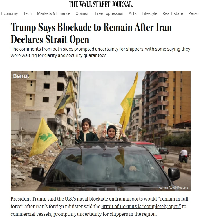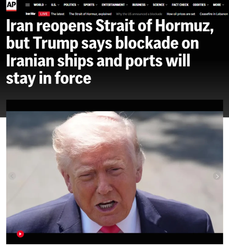 2. 美国对伊朗港口的封锁仍在继续,并未因海峡开放而解除。