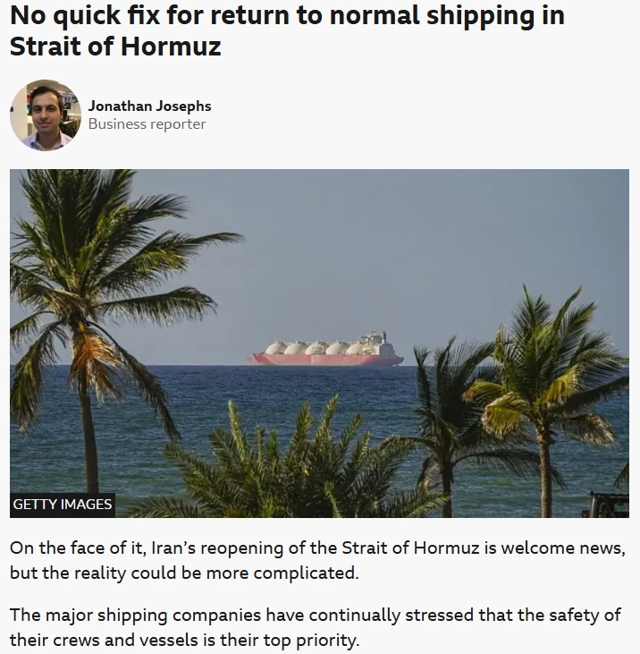 最近,欧洲新闻台网站在 17 日发布了一则引人关注的报道,把目光聚焦在了全球能源咽喉——霍尔木兹海峡。虽然伊朗方面已经正式宣布海峡对商业船只开放,但实际的市场反应却显得相当谨慎。