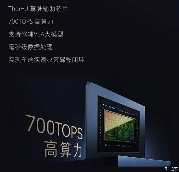 2. 核心配备的是Thor-U 辅助驾驶芯片,提供的算力高达700TOPS。这个算力水平在行业内绝对是第一梯队的,意味着车辆处理海量数据的能力极强,面对突发状况能瞬间做出判断,不卡顿、不延迟。