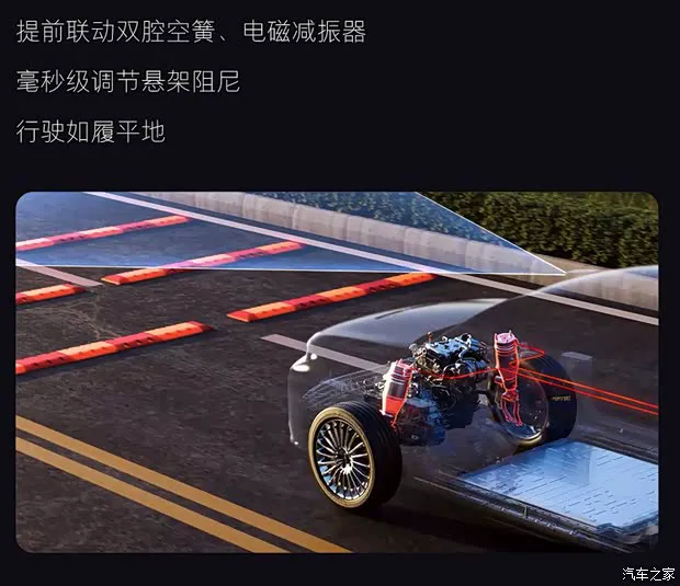 除了续航给力,新车在底盘技术上更是下足了功夫。车辆配备了先进的数字底盘系统,并搭载了品牌自研的“硬核三件套”。这套组合拳包括了闭式双腔空悬、EDC 连续可变阻尼减振器以及支持20°后轮转向系统。