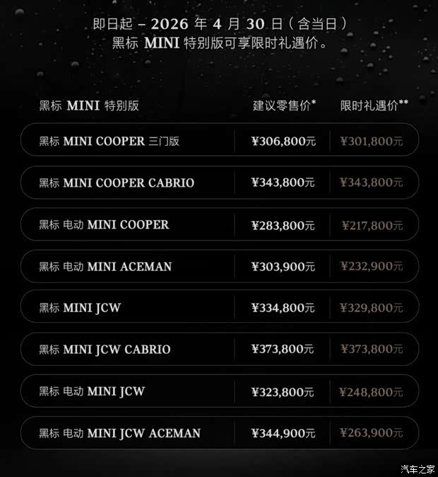 各位 MINI 的忠实粉丝注意啦,日前黑标 MINI 特别版已经正式上市了。这次厂家诚意满满,一口气推出了8 款不同配置的车型,涵盖了大家熟悉的 Cooper、JCW Performance 版本,甚至还有 ACEMAN 和纯电动版本。官方指导价区间在28.38 万元到 37.38 万元之间,但最吸引人的莫过于那个限时礼遇价,最低门槛直接下探到了21.78 万元,不过这个优惠是有时效性的,截止至 4 月 30 日,想入手的朋友得抓紧时间。
