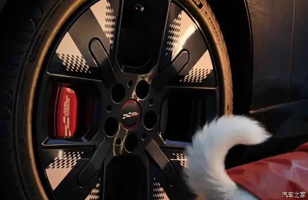 对于真正追求驾驶乐趣的朋友来说,MINI JCW 版本从来不仅仅是一个配置包,它是品牌运动灵魂的具象化。这次带来的 JCW 车型,在视觉辨识度上做到了极致,在前包围处加入了专属的红色装饰,配合醒目的红色卡钳以及极具赛车感的黑色赛道旗格纹饰板,视觉冲击力十足,一眼就能认出它的特殊身份。