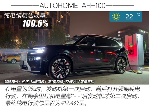 光看官方数据还不够,实测才是硬道理。我们在经济模式下进行了一场严肃的续航测试,平均时速保持在44.1km/h。最终实测下来的纯电续航竟然达到了412.4km,这是什么概念?这意味着续航达成率来到了100.6%。