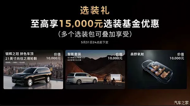 重点来了,如果在5 月 31 日前下定,你可以享受到15000 元的选装基金优惠。这意味着什么?意味着你不仅能把这些选装包免费拿下,甚至还能剩下一部分预算,性价比极高。