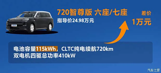 咱们先来剖析一下这个纯电 720 智尊版的定价逻辑。最值得关注的一点是,六座版和七座版实现了同价销售,统一售价为 24.98 万元。这种定价方式非常聪明,直接消除了家庭用户在座位布局上的价格纠结,让你能纯粹根据家庭成员数量来做决定,而不必为了预算妥协座位数。