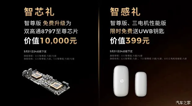 除了付费选装的优惠,还有两项实实在在的免费升级礼遇。首先是智芯礼,直接免费升级双高通 8797 芯片,这对车机流畅度是质的飞跃。其次是智感礼,免费送UWB 钥匙,让解锁体验更加无感便捷。