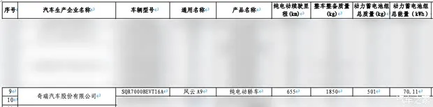 奇瑞风云 A9 纯电版现身免税目录,核心参数曝光