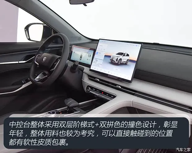 再看中控台的整体设计,采用了双层阶梯式加上双拼色的撞色设计。这种层次感丰富的设计语言,明显是为了凸显年轻化的定位,避免了传统内饰的沉闷感。