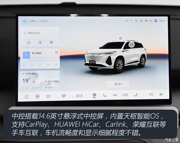 在软件层面,这套内饰的核心竞争力在于其内置的天枢智能 OS。对于现代用户来说,手机互联是刚需,这款车做得非常到位,它支持CarPlay、HUAWEI HiCar、Carlink 以及荣耀互联。这意味着无论你用的是苹果、华为还是其他主流品牌手机,都能实现无缝连接,这点必须好评。
