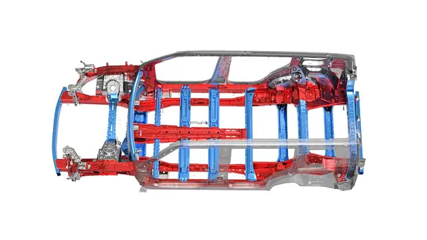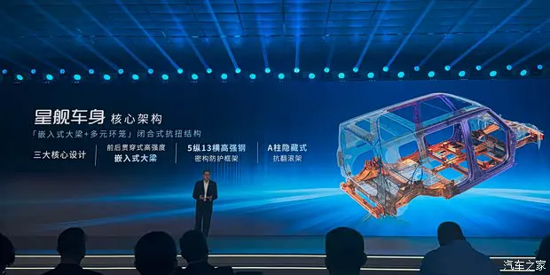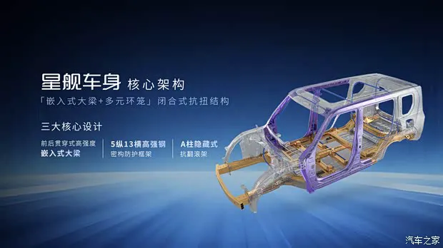 面对这个难题,广汽这次算是动真格了。他们集结了近百人的核心团队历时 29 个月攻坚,终于推出了全新的星舰车身技术。这项技术的核心在于其原创设计,采用了“嵌入式大梁 + 多元环笼”设计。
