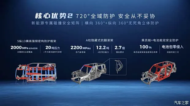 安全方面,星舰主打的是 720°全域碰撞防护。关键部位采用了2000MPa 级热成型钢,特别是在 A 柱区域,嵌入了2200MPa 级隐藏式抗翻滚架。这种设计让车辆的顶压能力达到了国标的2.7 倍。对于新能源车大家最关心的电池安全,它实现了侧面柱碰电池包0mm 侵入,彻底消除了安全隐患。