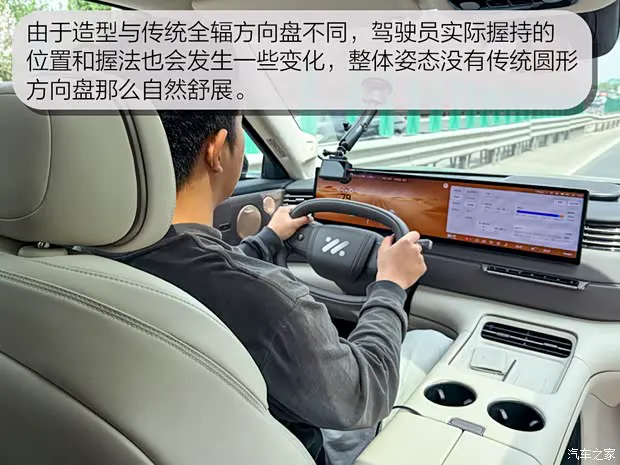 咱们这次测试的重点,主要集中在线控转向系统的实际表现上。而作为人车交互最直接的媒介,本次测试车配备的方向盘相当有讲究。官方给它起了个很长的名字,叫“超广角视野全幅柔感瞬热方向盘”。虽然这名字念起来略显拗口,但仔细拆解下来,其实都是围绕驾驶体验做的文章。