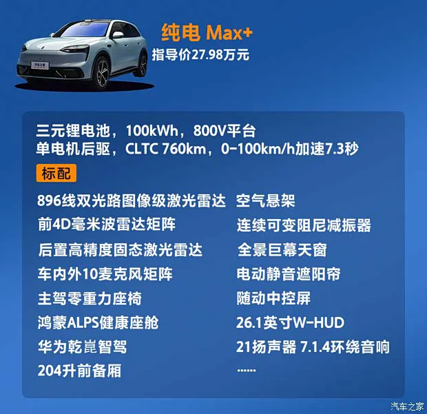 接下来重点看看这台纯电 Max+ 车型,指导价 27.98 万,我们的推荐指数为四星。作为纯电版的入门款,它比增程版贵了 2 万元。我们可以从以下几个核心维度来审视这台车: