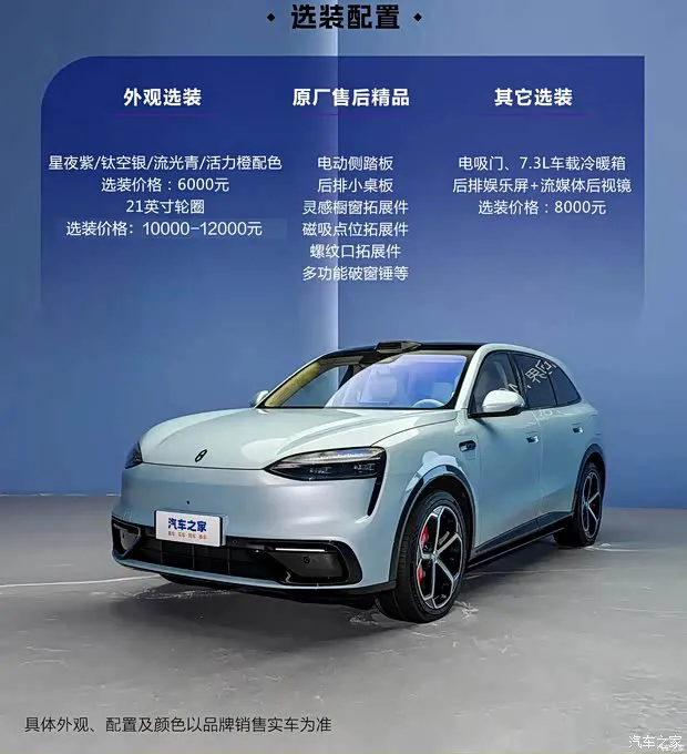 问界 M6 提供的选装还是挺丰富的,车身颜色、内饰颜色和轮圈都拿出了不少花样,还有丰富的原厂精品。比较特别的是,在旗舰大块头 SUV 常见的冰箱、电吸门和后排屏这些偏家庭向的配置,在问界 M6 这里都可以选装。这种配置下放策略,极大地提升了车辆的舒适性与便利性上限。
