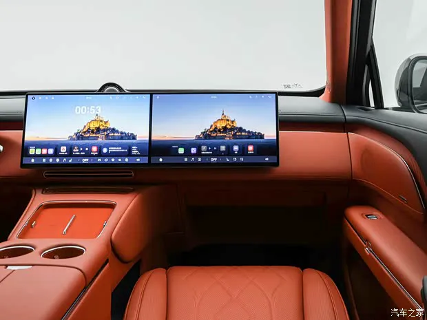 除了坐得舒服,玩得也要开心。后排专门配备了一块21.4 英寸吸顶屏,无论是看电影还是办公,都能带来影院级的视觉沉浸感。此外,车内还嵌入了13 升双开门冰箱,这一细节设计极大地丰富了用车场景,无论是家庭出游还是商务接待,都能随时提供冷饮或保鲜食物,真正实现了移动生活空间的品质化升级,让车不再仅仅是交通工具,而是生活空间的自然延伸。
