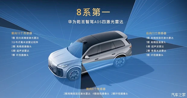 新车在硬件上可是下了血本,首次搭载了华为 896 线四激光雷达系统,具体配置是 1 颗主激光雷达加上 3 颗固态激光雷达。这还没完,再加上高清摄像头和毫米波雷达的配合,这套感知套件相当于给车装上了“超级眼睛”,大大减少了感知盲点。