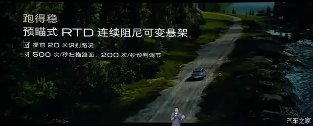 除了动力和续航,这台车在舒适性配置上也下了狠功夫。车辆配备了一套预瞄式 RTD 连续阻尼可变悬架。