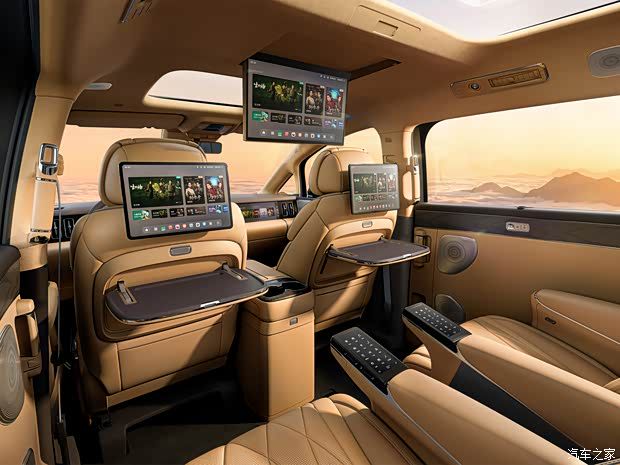 买这种车,第二排舒不舒服才是关键。新款腾势 D9 在这块儿下了功夫。除了保留原来的靠背屏幕,这次增加了吸顶屏。不管是一家人出门还是商务接待,后排想看个电影什么的,选择更多了,体验也更好。