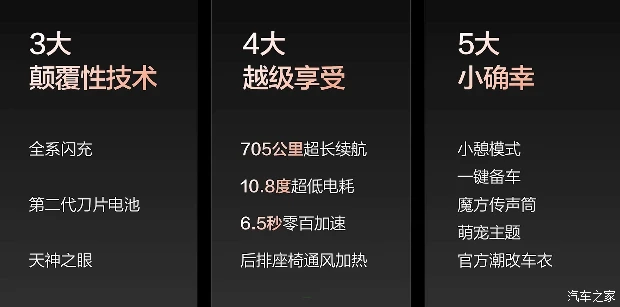 动力部分,新车将会提供240kW 的大功率电机,0-100km/h 加速时间为 6.5 秒,动力响应相当迅猛。电池方面,该车搭载的是69kWh 的磷酸铁锂二代刀片电池,车辆最大续航达到 705km,综合电耗为 10.8kWh/100km,兼顾了性能与能耗表现。