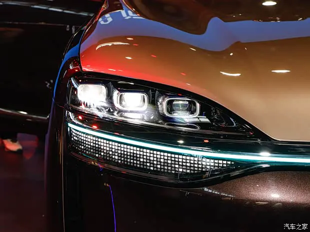 车头部分绝对是整车的视觉焦点。最大的亮点在于那个可发光的 LOGO,搭配贯穿式的头灯组,不仅提升了科技感,更重要的是从侧面看过去,呈现出一种“飞檐高挑”的视觉效果。这种设计感十足的处理,把传统美学和现代科技结合得相当到位。