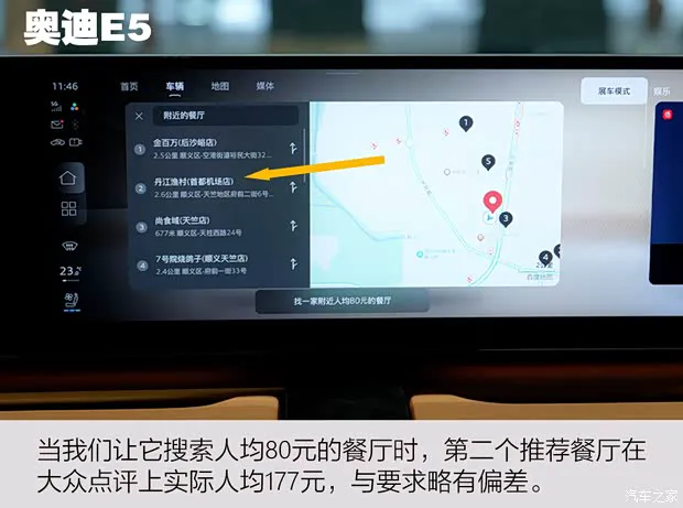 在此次评测环节中,我们重点考察了车机系统的生态拓展能力。和前面测试的两款车型情况相同,奥迪 E5 同样没能通过“语音订外卖”这一关。当用户尝试通过语音指令下单时,系统并未直接完成任务,而是建议用户通过手机 APP 进行操作。这在一定程度上说明,目前车联网在特定生活场景的生态打通上,仍有进步空间。