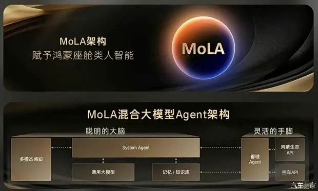 坐进车内,你会发现座舱体验有了质的飞跃。这里引入的是鸿蒙座舱 HarmonySpace 5,底层技术采用了先进的 MoLA 混合大模型 Agent 架构。这不仅仅是换个界面,而是让车机拥有了“大脑”,能够实现类人化交流,懂你的意思。