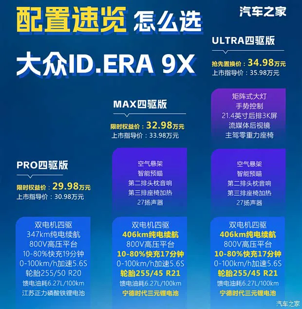 咱们今天来好好聊聊 ID.ERA 9X 这款车的配置分布。说实话,这次车企在产品策略上做得挺干脆,全系仅提供三款配置,分别是 PRO 四驱版、MAX 四驱版以及 ULTRA 四驱版。这种精简的阵容,其实对于咱们消费者来说倒是好事,不用在太多的车型里纠结,选起来更清晰。