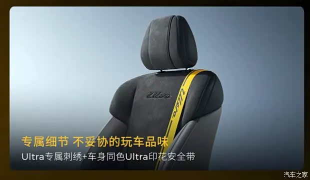 3. 内饰氛围:车内采用逐风灰内饰配色,座椅升级为翻毛皮运动座椅,并拥有 Ultra 专属刺绣。值得一提的是,安全带也采用了车身同色 Ultra 印花,细节满满。