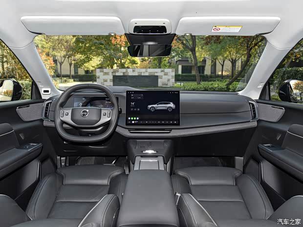 具体来说,驾驶位前方是一块9 英寸的全液晶仪表盘,配合经典的三辐式多功能方向盘,操作手感与视觉信息获取都非常便捷。而视线往中间移,14.5 英寸的中控多媒体触控屏占据了核心位置,加上贯穿式空调出风口设计,不仅拉伸了横向视觉宽度,更让整车内饰显得简洁而富有未来感。