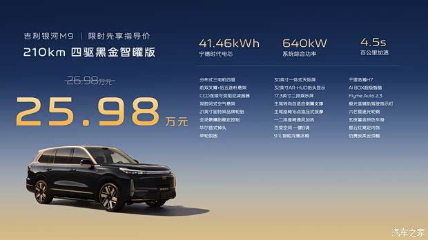 吉利银河 M9 黑金智曜高定版已经正式亮相,这次只带来了一款配置,诚意相当集中。官方指导价定在 26.98 万元,但考虑到市场竞争力,官方给出了限时优惠,到手价仅需 25.98 万元。这个定价策略很明显,就是想用一款高定车型来拉高品牌质感,同时保持价格竞争力。