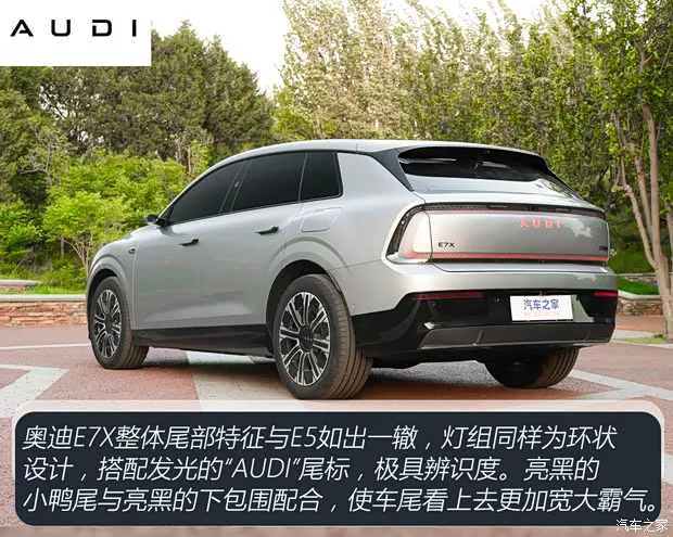 聊到外观,E7X 走的是一条稳妥又高效的路线。它与奥迪 E5 Sportback 的设计语言基本相似,这种家族化的面孔,好处显而易见。你不需要花费太多精力去适应新设计,一眼就能认出这是 AUDI 品牌的车。说白了,大家完全可以把它理解为奥迪 E5 的增高增大版,这种基于成熟设计的迭代,往往意味着更少的试错成本和更稳定的审美体验。