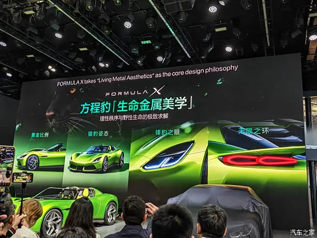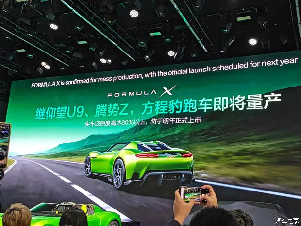 除了走量的轿车系列,方程豹还带来了一款吸引眼球的全新跑车——FORMULA X。这款车在设计语言上延续了此前方程豹 SUPER 9 的理念,视觉冲击力极强。对于概念车量产通常会“缩水”的担忧,官方给出了定心丸:量产版本造型还原概念版设计度高达 80%。这意味着我们在路上见到的实车,将极大程度保留概念车的未来感。这款梦幻座驾预计将在2027 年上市,值得长期期待。