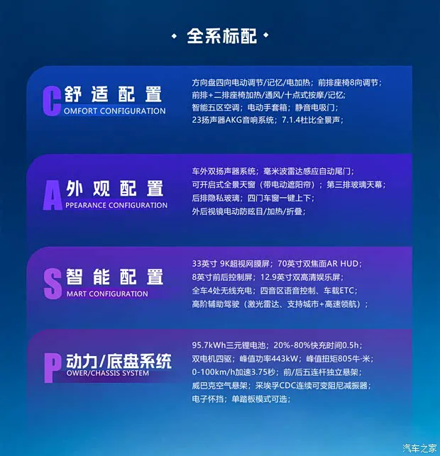 在科技配置上,它也没玩虚的。23 扬声器的 AKG 音响系统是全系标配,配合后排的娱乐屏幕,听歌看片都很爽。还有像电吸门这种增加仪式感的配置,以及代表智能驾驶硬实力的激光雷达,也都包含在内。这些配置堆在一起,不仅仅是好看,更是为了让你在日常用车中感受到实实在在的便利和高级感。