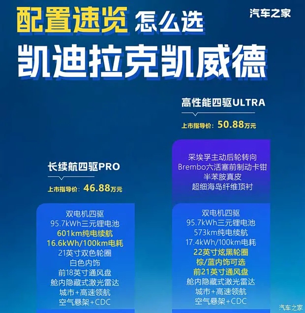 总的来说,这两款车的配置差异并没有形成断层式的差距。入门版是理性消费的典范,而高配版则提供了更多的“情感价值”和驾驶乐趣。特别是后轮转向和 Brembo 刹车的加入,让 ULTRA 版本在操控极限上有了质的飞跃。结合最终的售价来看,凯威德这次的标配策略相当合理,既照顾了实用派,也满足了性能控。
