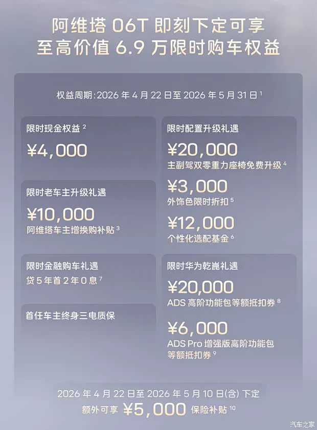 除了常规的权益包,官方还设置了一个更早的时间节点。如果你在2026 年 5 月 10 日(含)前下定,可以在上述权益基础上,额外享受 5000 元保险补贴权益。这意味着,早期决策的用户能够锁定更高的综合优惠,对于已经意向明确的消费者,这个时间点值得重点关注。