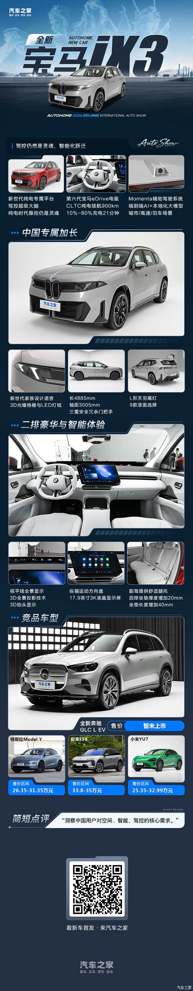 综合来看,全新宝马 iX3 长轴距版形成的产品特质非常清晰,那就是“无明显短板、单项有优势”。它不像某些车型那样偏科严重,而是在保持宝马传统优势的同时,补齐了智能化和空间表现的短板。对于消费者而言,这意味着在选择豪华电动 SUV 时,iX3 长轴距版成了一个兼顾面子与里子的稳妥之选,尤其是在面对奔驰 GLC EV 以及其他新势力车型时,它的竞争力不容小觑。
