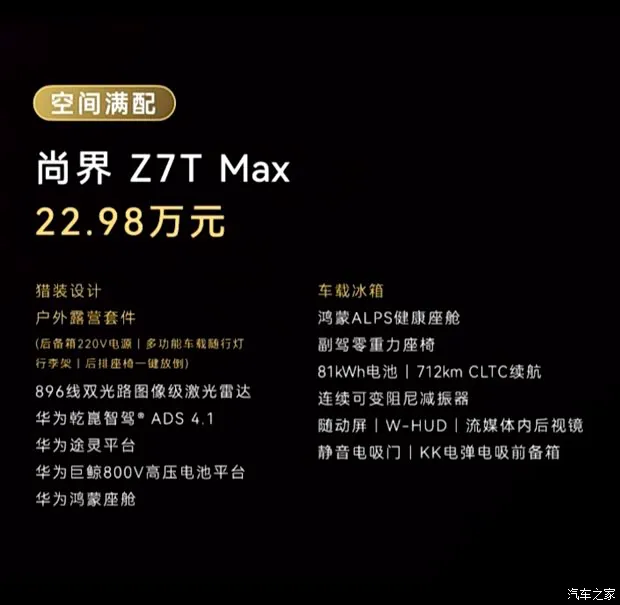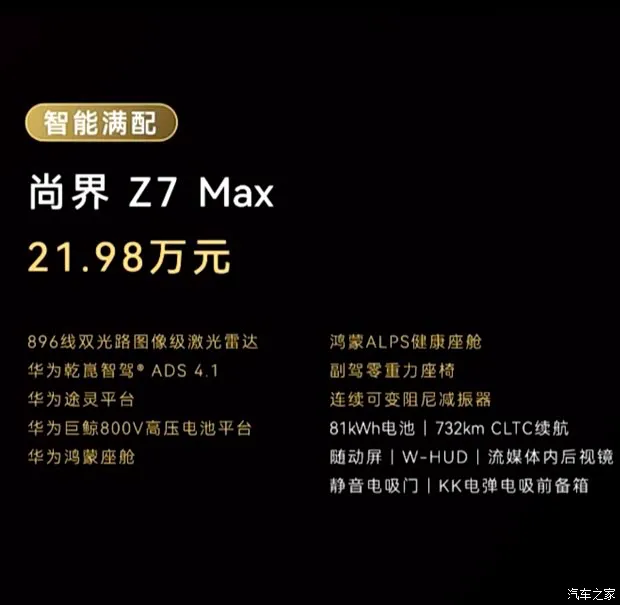这台车最大的底气,来自于华为技术的全面赋能。尚界 Z7 定位中大型轿跑,全系标配了五大华为黑科技,可以说是标配即满配: