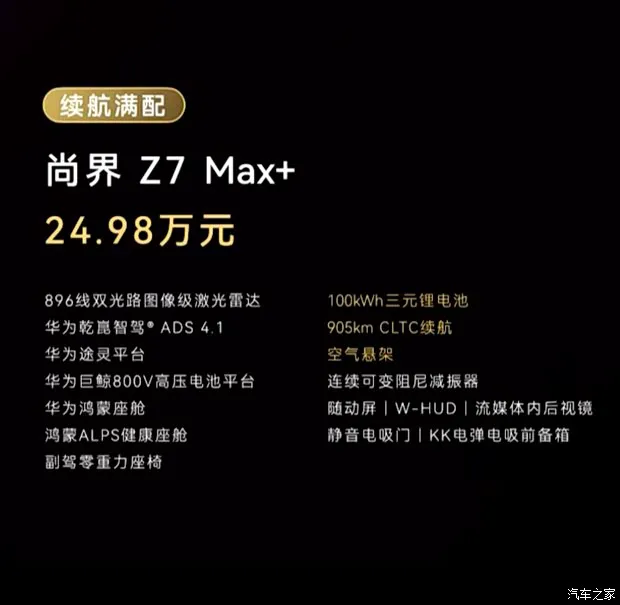 看完竞品核心差异表,咱们再来算笔账。尚界 Z7 Max+ 的指导价在24.98 万至 25.98 万元之间,与小米 SU7 Pro、特斯拉 Model 3 长续航版价格高度重合。但在核心硬件上,Z7 给出了896 线激光雷达和华为 ADS 4.1 这种通常要高配甚至选装才有的配置。车身尺寸上,5036mm 的车长和 3000mm 的轴距,也保证了中大型轿车的空间优势。如果你正在观望 25 万级纯电轿车,想要智驾顶尖、续航扎实且配置豪华的车型,尚界 Z7 绝对是一个绕不开的重磅选项。