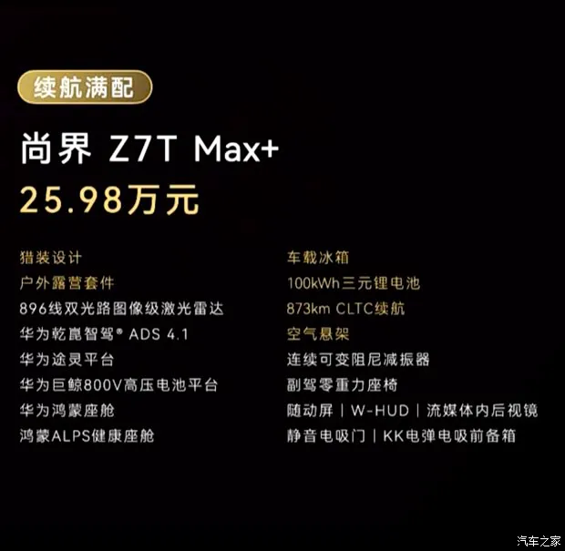 现在的 25 万级纯电轿车市场,竞争可以用“白热化”来形容。各大品牌都在设计和配置上拿出了看家本领:小米 SU7 Pro 靠着长续航和流量吸引年轻人;特斯拉 Model 3 长续航后驱版凭借品牌效应和能耗控制守住主流地位;极氪 001 以大空间和底盘质感收获稳定受众;小鹏 P7+ 则依托成熟智驾与 800V 平台主打均衡体验。在这样的群雄环伺下,尚界 Z7 Max+ 凭借标配 896 线激光雷达与 ADS 4.1 的硬核实力,再加上流行的轿跑造型,直接入场搅局。
