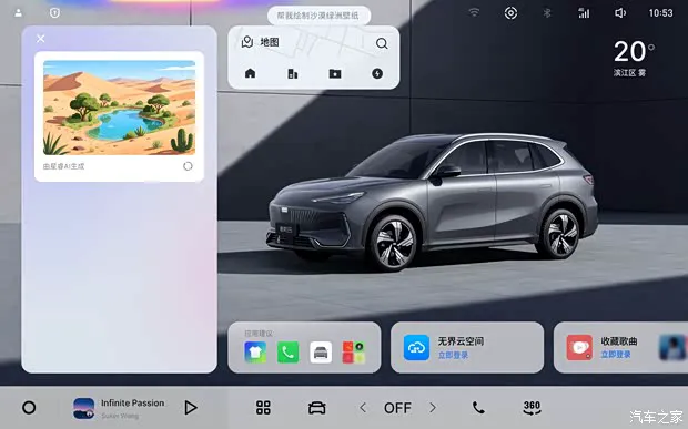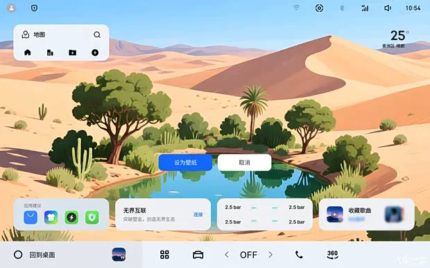 更让人眼前一亮的是新增的 AI 生成壁纸功能。以前想换个壁纸,得去相册翻或者下载,现在不一样了。用户通过语音助手输入创意,车机可实时生成高清壁纸并一键设置。这个过程非常流畅,真正实现“脑洞即画面”,让个性化定制变得零门槛,每个人的车机界面都可以是独一无二的。