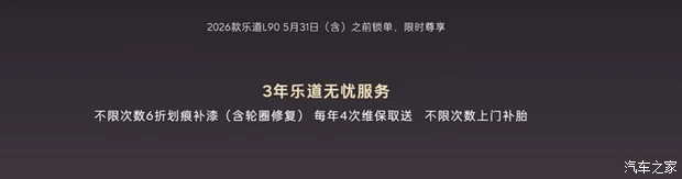 买车只是一刹那,用车却是长期的事儿。这次权益里包含了3 年乐道无忧服务,具体细节非常实用。比如平时难免的小剐蹭,可以享受不限次数 6 折划痕补漆,甚至连轮圈修复都包含在内。对于忙人来说,每年 4 次维保取送服务能节省大量时间。另外,不限次数上门补胎也是个很贴心的保障,再加上3000 购车积分,整体服务体验直接拉满。