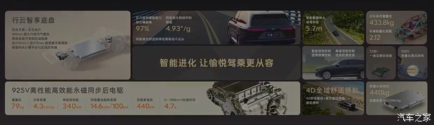 对于日常家用来说,单电机后驱版已经相当充沛,最大功率达到340kW,百公里加速仅需5.9 秒。如果你对驾驶激情有更高要求,双电机四驱版则能带来更强烈的推背感,其综合最大功率高达440kW(前 100kW/后 340kW),将0-100km/h 加速时间压缩至 4.1 秒,完全可以媲美高性能运动车型。