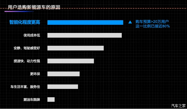 现在的消费者到底在想什么?数据不会撒谎。根据汽车之家的最新统计显示,接近 80% 的用户在选购新能源车时,首要考虑的因素是智能化程度更高。这个比例相当惊人,它说明了一个明显的趋势: