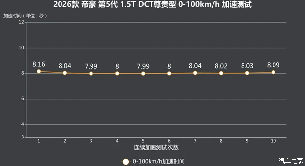 车辆加速初段较为有力,在经过两次换挡后,最终在三挡“破百”,其中一挡升入二挡时会有较为明显的顿挫感,在升入三挡后加速感会趋于平淡,最终0-100km/h加速最快成绩定格在7.99s。第5代帝豪的加速成绩,比同为1.5T的星瑞还要快了0.6s。并且在经历了10次连续加速测试后,车辆的成绩波动并不大,整体表现出了不错的稳定性。 更多精彩视频,尽在汽车之家视频平台中途加速部分,车辆的40-80km/h加速时间为3.43s,80-120km/h加速时间5.45s,超车时也更有信心,不过在匀速驾驶时突然深踩下加速踏板,变速箱还是需要有半秒左右的响应时间。● 油耗测试看过加速,再来看看大家最近最为关心的油耗。我们将驾驶模式调整至“经济”,空调23℃自动。在行驶了204.4公里后,平均速度为42.8km/h,表显油耗仅为5.8L/100km。实际加注92#燃油12.65L,计算得出实测油耗为6.19L/100km,这个表现还是符合预期的。