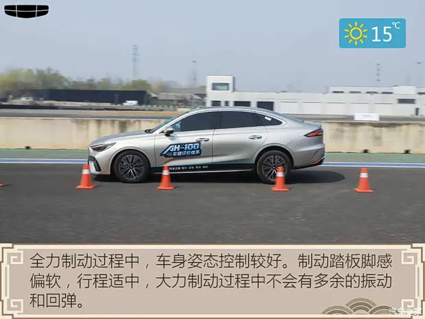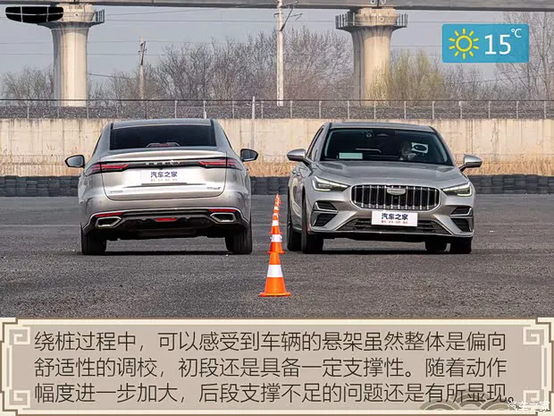 ● 绕桩我们在场地也对其进行了绕桩,第5代帝豪在绕桩过程中,同样可以感受到它的悬架虽然整体是偏向于舒适性的调校,但悬架初段具备一定支撑性,车身在重心转移初期的响应还算干脆,不过随着动作幅度进一步加大,悬架后段支撑不足的问题还是会有所显现,车身侧倾也会变得更明显。