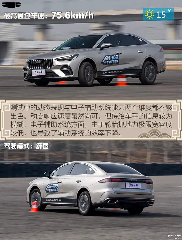 第5代帝豪在麋鹿测试中虽拿到了75.6km/h的成绩,但在测试中的动态表现与电子辅助系统能力两个维度的表现都不够出色。