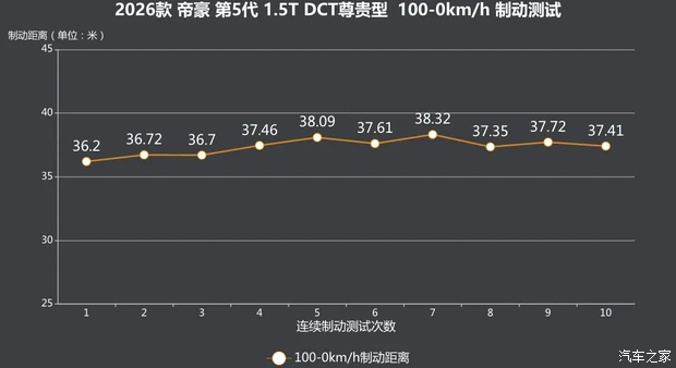更多精彩视频,尽在汽车之家视频平台● 安全性制动本次实测的第5代帝豪所配备的轮胎规格为215/55 R17,品牌是赛轮的Turismo Extreme ES22。制动测试中,车辆的100-0km/h最短制动距离为36.20m。在连续10次制动测试中,车辆平均制动距离为37.36m,会有轻微的热衰退现象。