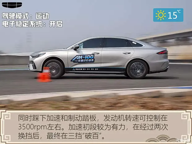 ● 加速表现既然1.5T发动机+DCT变速箱的动力组合是帝豪首次搭载,那我们就先来看看它的加速表现。实际上,这套动力组合与星瑞的1.5T车型相同,发动机最大功率181Ps,最大扭矩290N·m,比第5代帝豪1.5L车型要多出了61Ps和140N·m,传动部分匹配的是7挡湿式双离合变速箱。加速测试前,我们将驾驶模式调节至“运动”,由于关闭电子稳定系统后,起步轮胎打滑严重会损失一些时间,因此我们开启电子稳定系统进行测试。同时踩下加速和制动踏板,发动机转速可控制在3500rpm左右。