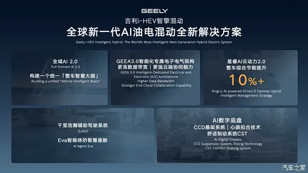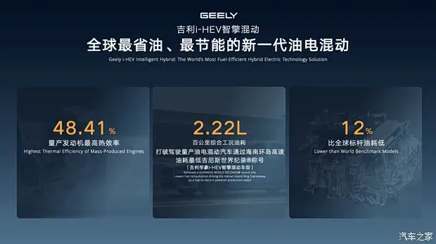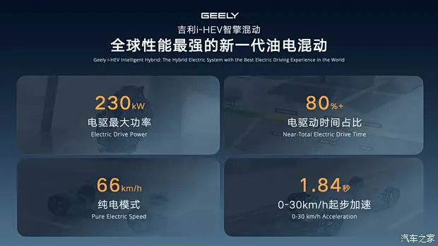 新车采用1.5TD混动专用四缸发动机+P1/P3电机,发动机效率更高,热效率48.41%,500bar超高压喷射系统,11合1超大功率混动专用电机,最大功率230千瓦,0-30km/h加速仅1.84秒,比传统混动快18%,动力响应仅10毫秒,加速过程介于油车与电车之间,传动系统匹配3挡DHT,还能实现66km/h纯电模式行驶,比传统混动高20%,发动机启动时NVH只比纯电高1分贝,官方WLTC百公里油耗仅4.75L,大幅降低日常通勤成本。底盘方面,新车搭载 CCD可变阻尼悬架,让行驶平顺性提升33%。● 编辑点评:相比目前主流的插混车型,星越L i-HEV智擎混动可实现不插电,更加便捷,同时相比日系混动车型来说,动力更强,应对复杂路况更从容,让油混车型也能实现兼顾动力与油耗。结合原先星越L在智能化、舒适配置、空间层面的优势,整体产品竞争力更进一步。除了本次发布的星越Li-HEV智擎混动和星瑞i-HEV智擎混动之外,今年博越L、帝豪等主销车型也将搭载i-HEV智擎混动,后续吉利中国星将全面普及i-HEV智擎混动。