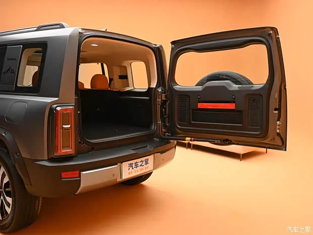车身侧面采用外拉式门把手,C柱位置进行了加粗处理,上面有山峦图案的印花。车顶配备行李架,丰富用车场景。车尾线条平直简约,拥有一个备胎,上方有长城汽车的英文标识“GWM”。车门左右两侧搭载“日”字形尾灯,下方包围黑银相间,视觉层次感较为丰富。